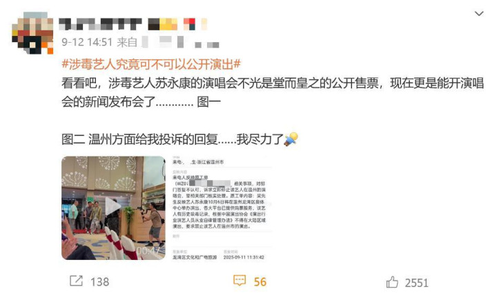 近日,有博主反映称,他向温州市相关部门投诉了苏永康将开演唱会一事,诉求停止该艺人在温州的演唱会。他发布的截图显示,龙湾区文化和广电旅游体育局答复工单称,该演出活动经审核同意,材料齐全,程序符合要求,批准同意演出。公开资料显示,2002年,苏永康在酒吧因藏有毒品被捕,之后入狱强制勒戒11天即出狱。